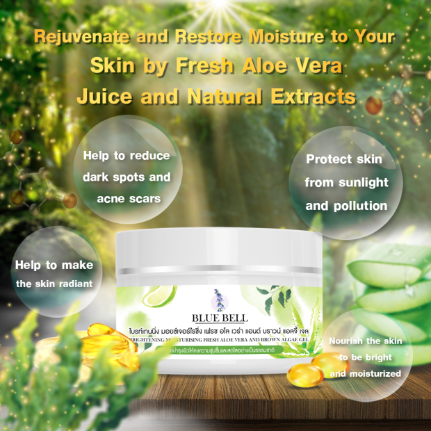 Brightening Moisturizing Fresh Aloe Vera and Brown Algae Gel 250 Baht per piece (7.5 USD per piece) buy 2 get 1 free until the end of year 2021 including delivery cost for Thailand purchase.