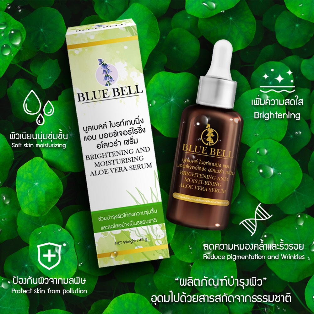 บลูเบลล์ไบรท์เทนนิ่ง แอน มอยซ์เจอร์ไรซิ่ง อโลเวร่า เซรั่ม ราคา 350 บาทต่อชิ้น ซื้อ 2 ชิ้นแถม 1 ชิ้น จนถึงสิ้นปี 2564 ราคารวมค่าขนส่งภายในประเทศ